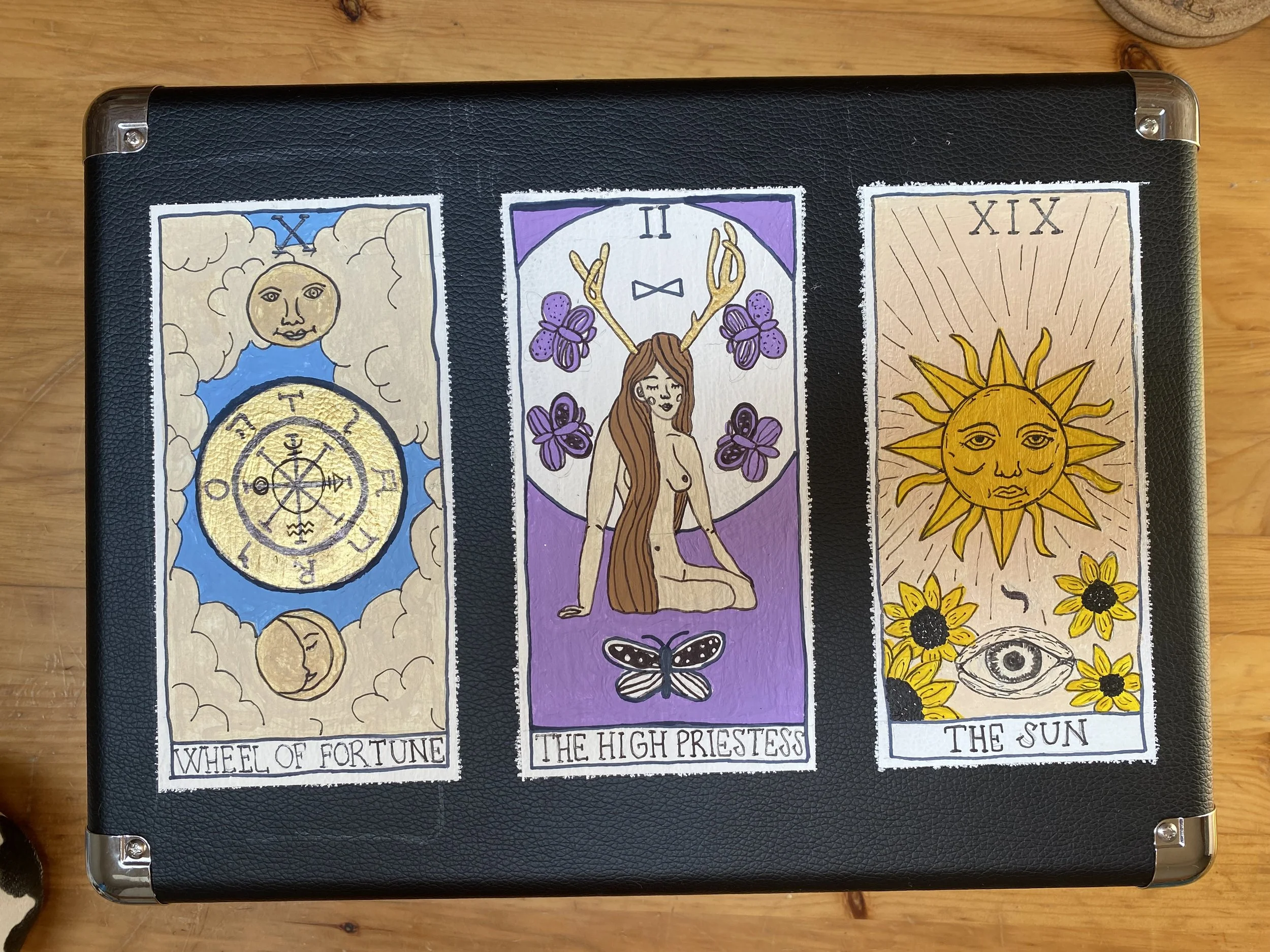 Last summer I found a black record player on the street! I brought it home, and to my delight, it worked! So I decided to paint three of my favorite tarot cards (from left to right: The Wheel of Fortune, The High Priestess, and The Sun) on it!
