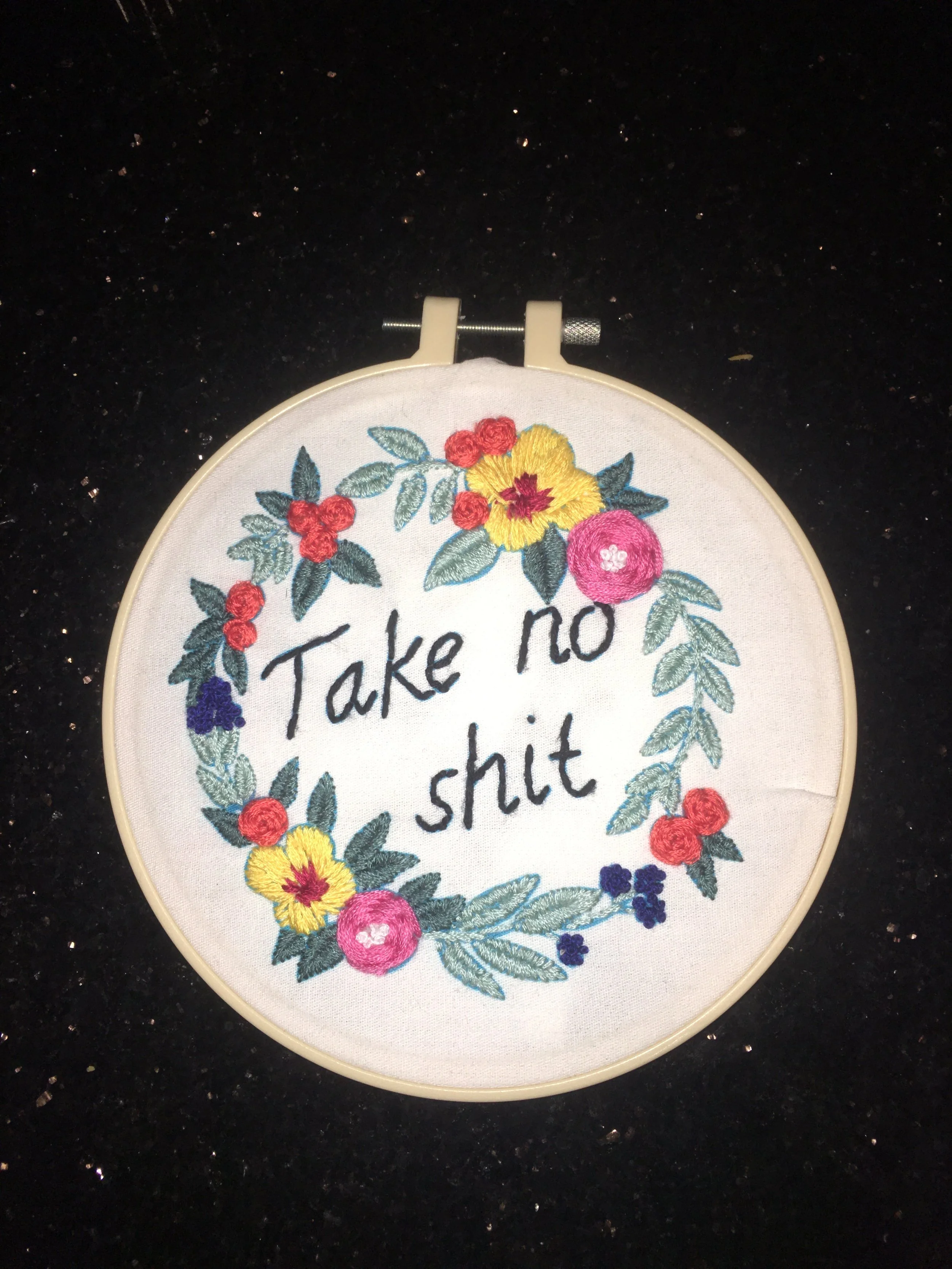 I had mused about getting into embroidery, but hadn’t taken the first steps. One of my friends got me a starter kit with a design template for a gift exchange, and the rest is history! I love embroidery because it’s an art form that was looked down upon for a long time as being “women’s work” and I’m taking that back and taking no shit!